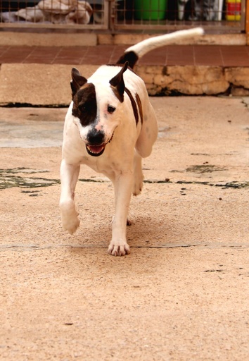 Esta menina é de porte médio, cruzada de raça Bull Terrier Inglês.