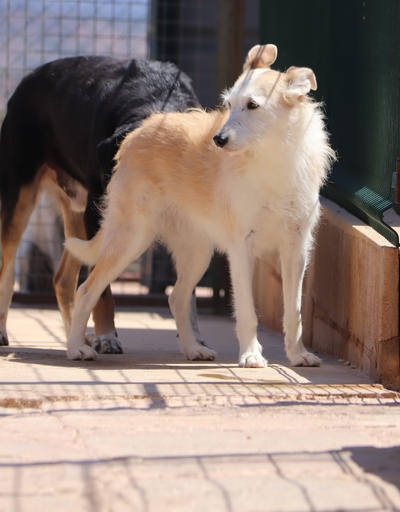 Esta menina é uma cadela de porte médio, muito tímida, que precisa de tempo para ganhar confiança e se sentir segura.